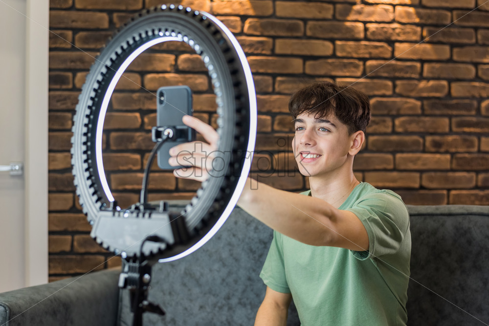 Home » Shop » photo » A young smiling man blogger influencer shooting himself on smartphone on a tripod with ring light in a studio