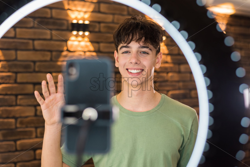 Home » Shop » photo » A young smiling man blogger influencer shooting himself on smartphone on a tripod with ring light in a studio