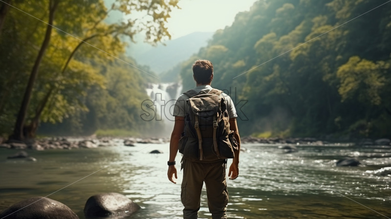 A couple hugging each other and talking on a tent terrace at glamping. Lush forest around