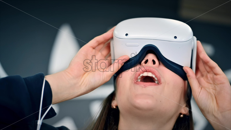 A young interested woman playing in VR games using VR glasses and controllers, red and blue illumination. Slow motion virtual reality Download royalty free stock video footage. Royalty Free Stock Video Footage