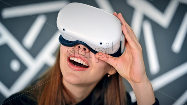 A young woman in VR glasses is excited while playing VR games. Slow motion