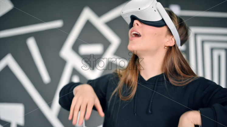 A young woman is excited while putting on VR glasses, controllers. Slow motion virtual reality