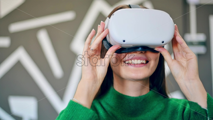 A young woman is excited while putting on VR glasses, controllers. Red and blue illumination. Slow motion virtual reality Download royalty free stock video footage. Royalty Free Stock Video Footage
