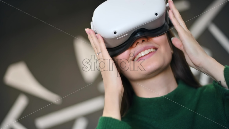 A young woman is excited while putting on VR glasses, controllers. Red and blue illumination. Slow motion virtual reality Download royalty free stock video footage. Royalty Free Stock Video Footage