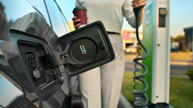 A young woman takes a charger at a car charging station and inserts it into electric car. Chisinau, Moldova Royalty Free Stock Video Footage