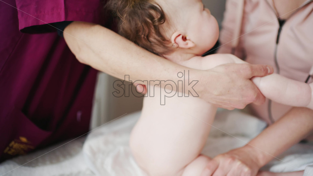 Infant lying relaxed on a bed, looking upward while a caregiver and the mother stay nearby doing mobility exercises