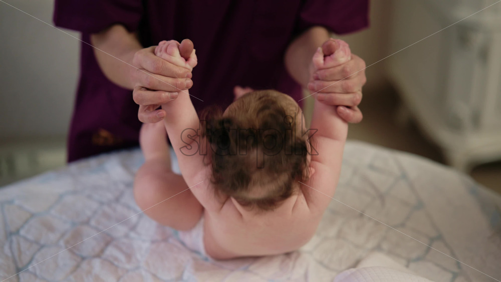 Close up of a caregiver holding a baby under the arms, helping them stand upright and walk