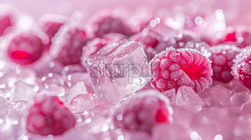 Advertising photo with ice cubes, frozen pink fruits, on a pink background