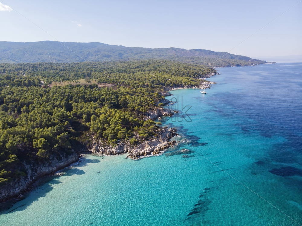 Aegean sea coast with blue transparent water and ship, greenery around, rocks, bushes and trees, view from the drone, Greece