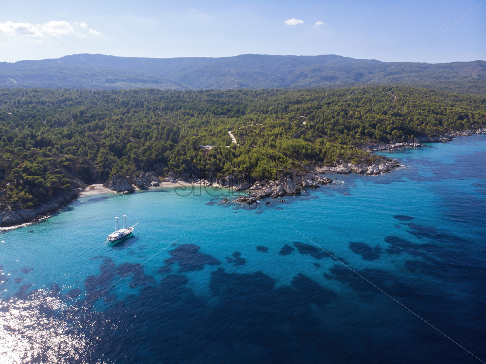 Aegean sea coast with blue transparent water and ship, greenery around, rocks, bushes and trees, view from the drone, Greece