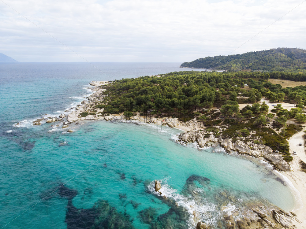 Aegean sea coast with blue transparent water, greenery around, rocks, bushes and trees, view from the drone Greece
