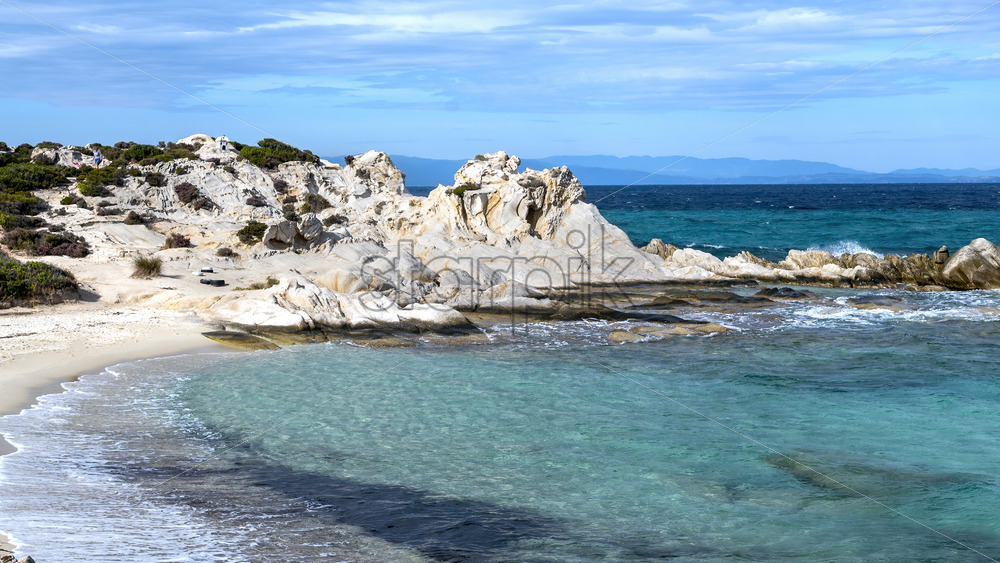 Aegean sea coast with rocks and resting people, mountain in the distance, greenery on the foreground, blue water, Greece