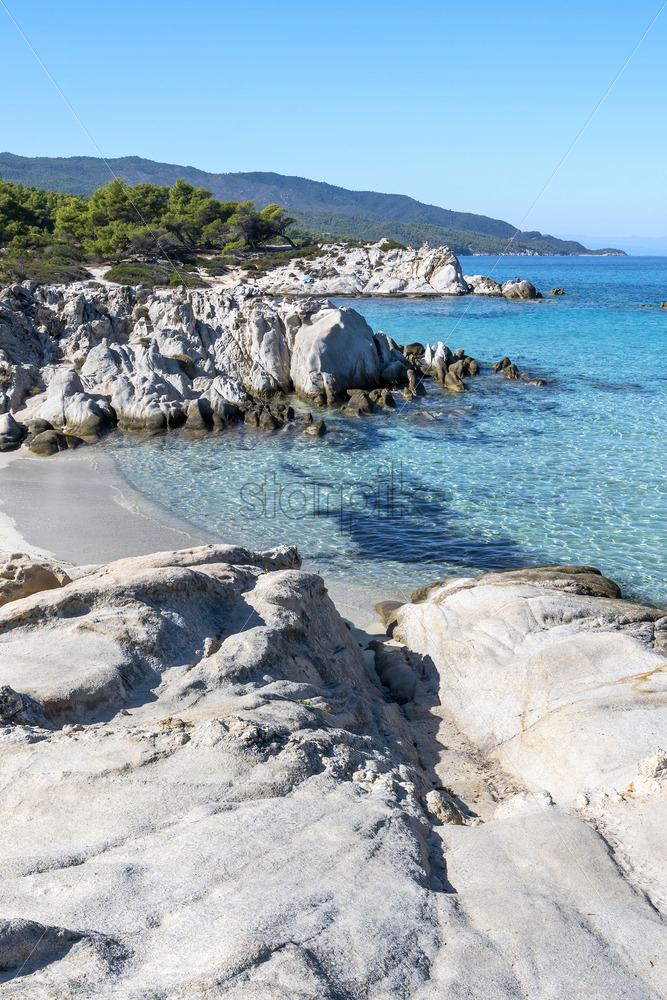 KARIDI, GREECE – OCTOBER 22, 2020: Aegean sea coast with lots of resting and swimming people on the beach, rocks and trees, mountains on the background