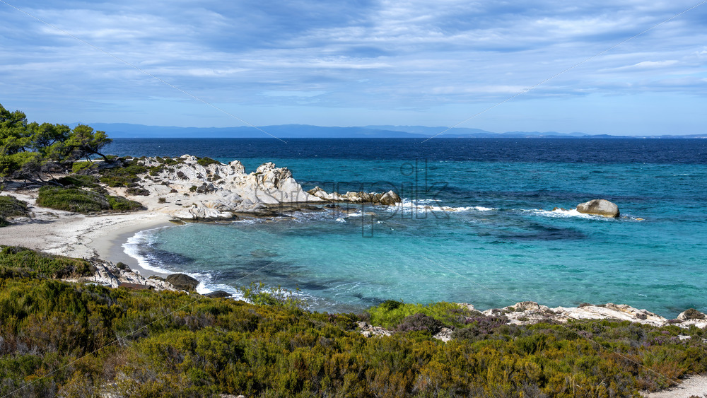 Home » Shop » photo » Aegean sea coast with greenery around, rocks, bushes and trees, blue water with waves, Greece