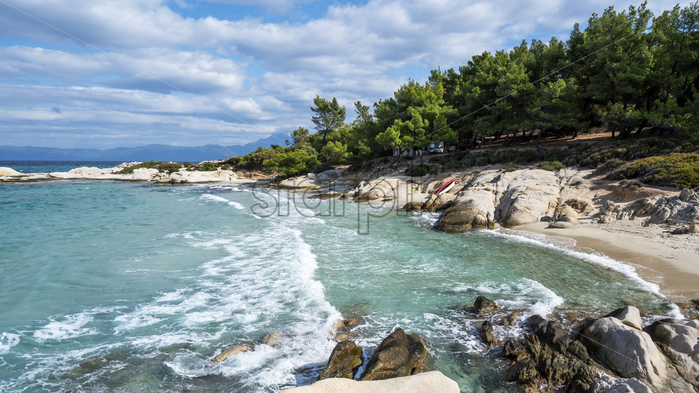 Home » Shop » photo » Aegean sea coast with greenery around, rocks, bushes and trees, blue water with waves, Greece