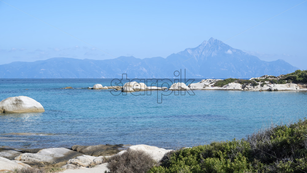 Home » Shop » photo » Aegean sea coast with rocks over the water and land in the distance, greenery on the foreground, blue water, Greece