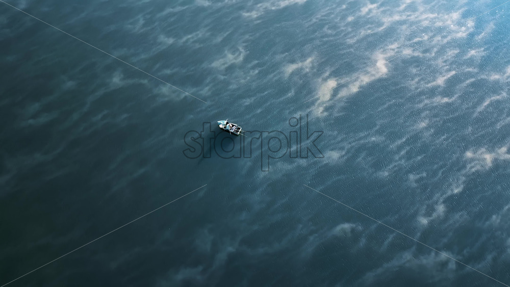 Aerial cinematic drone view of a man in a boat fishing on Nistru river at sunrise. Fog on the water in Moldova. Download royalty free stock video footage. Royalty Free Stock Video Footage