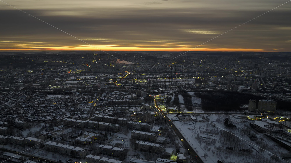 Aerial drone hyperlapse timelapse of Chisinau city covered in snow at night, blue hour. Winter in Moldova Royalty Free Stock Video Footage