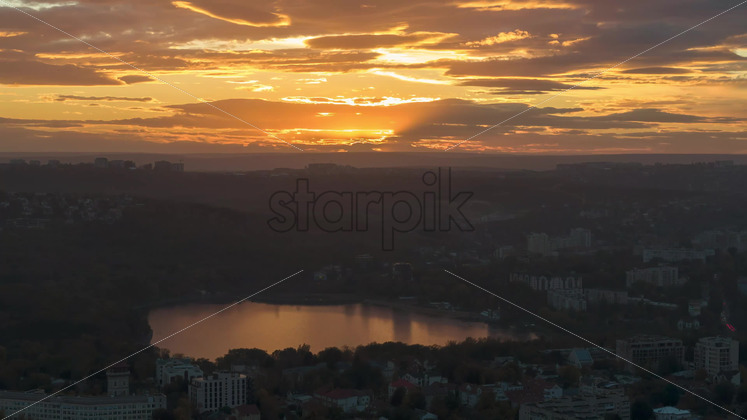 Aerial drone hyperlapse timelapse of sunset above Chisinau. Valea Morilor lake. Moldova Royalty Free Stock Video Footage