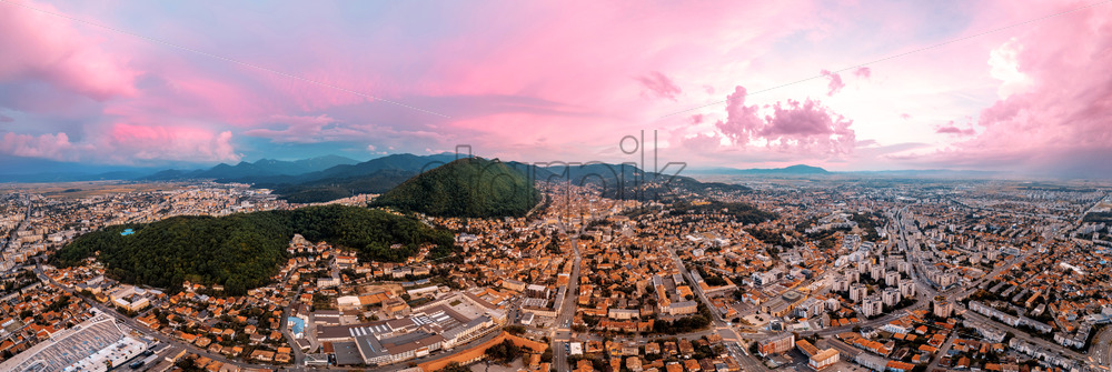 Home » Shop » photo » Aerial drone panoramic view of Brasov at sunset, Romania. Old city centre with old buildings, hills covered with greenery
