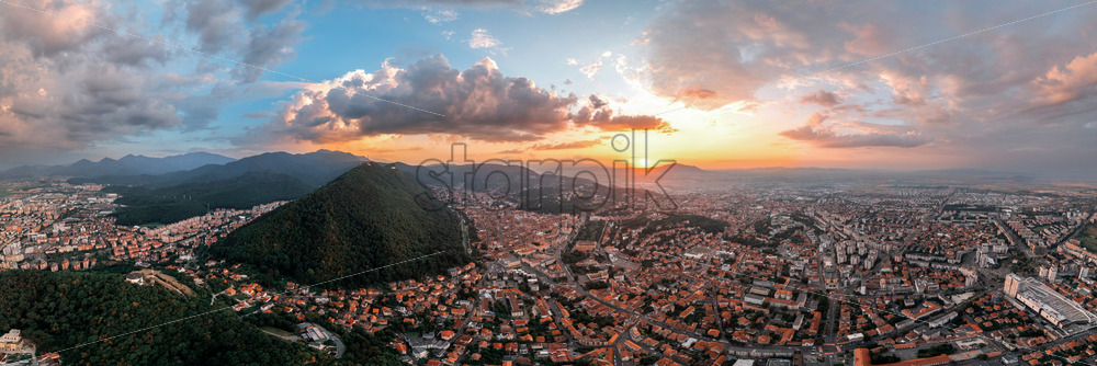 Home » Shop » photo » Aerial drone panoramic view of Brasov at sunset, Romania. Old city centre with old buildings, hills covered with greenery