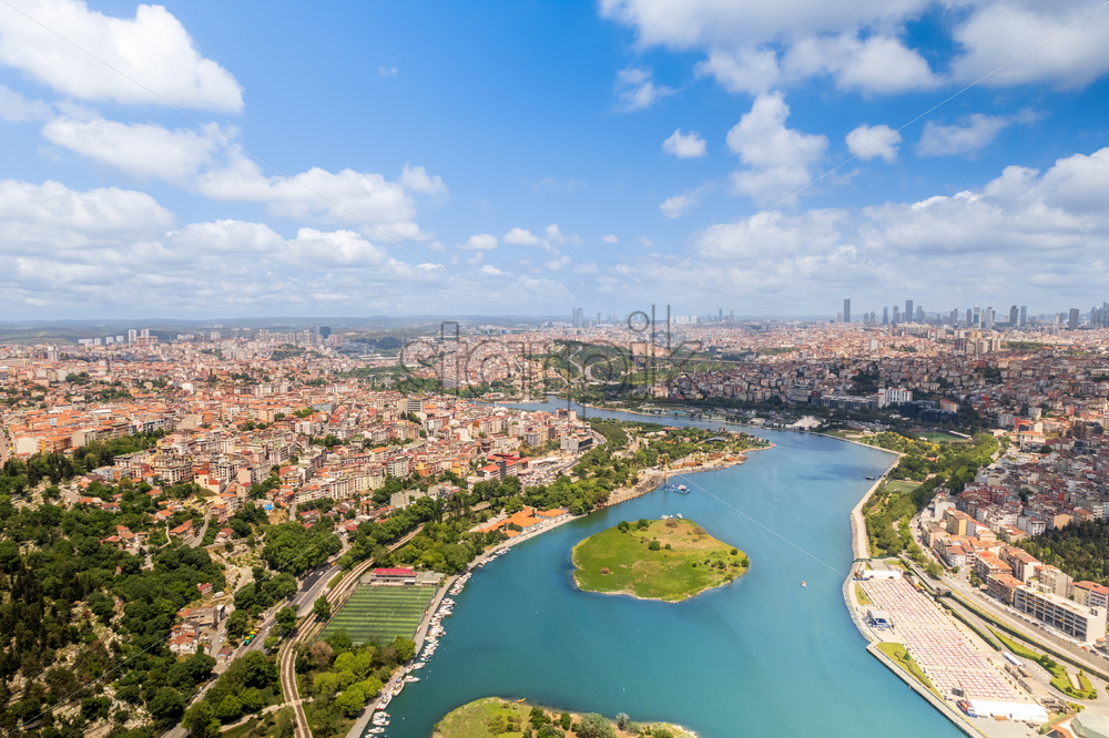 Home » Shop » photo » Aerial drone panoramic view of Istanbul, Turkey. Balat district with multiple residential buildings and greenery, Golden Horn waterway, downtown on the background