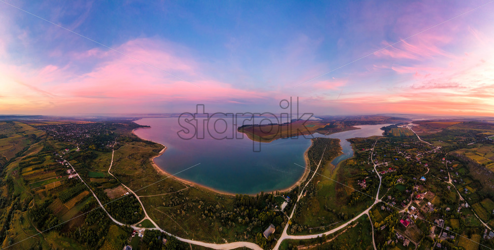 Home » Shop » photo » Aerial drone panoramic view of nature in Moldova at sunset. Village, river, wide fields