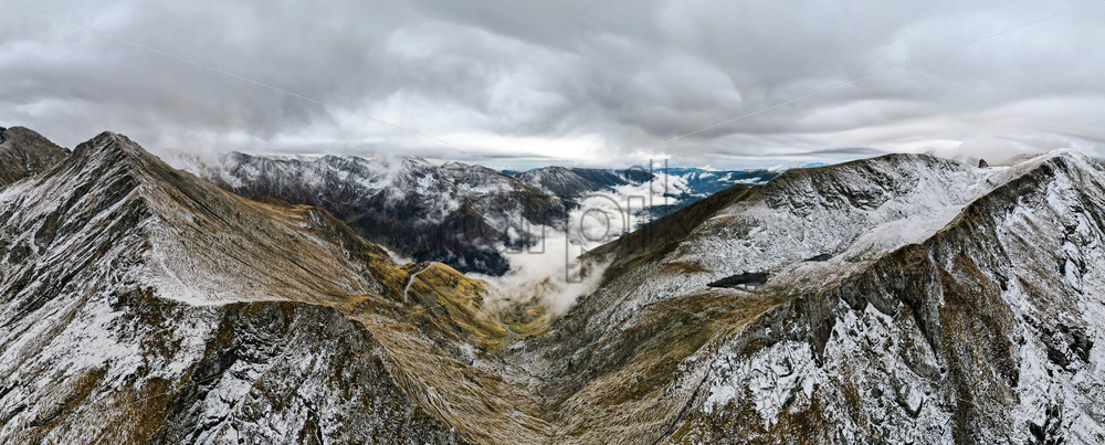 Aerial drone panoramic view of nature in Romania. Transfagarasan route in Carpathian mountains, rocky slopes covered with snow, valley, clouds