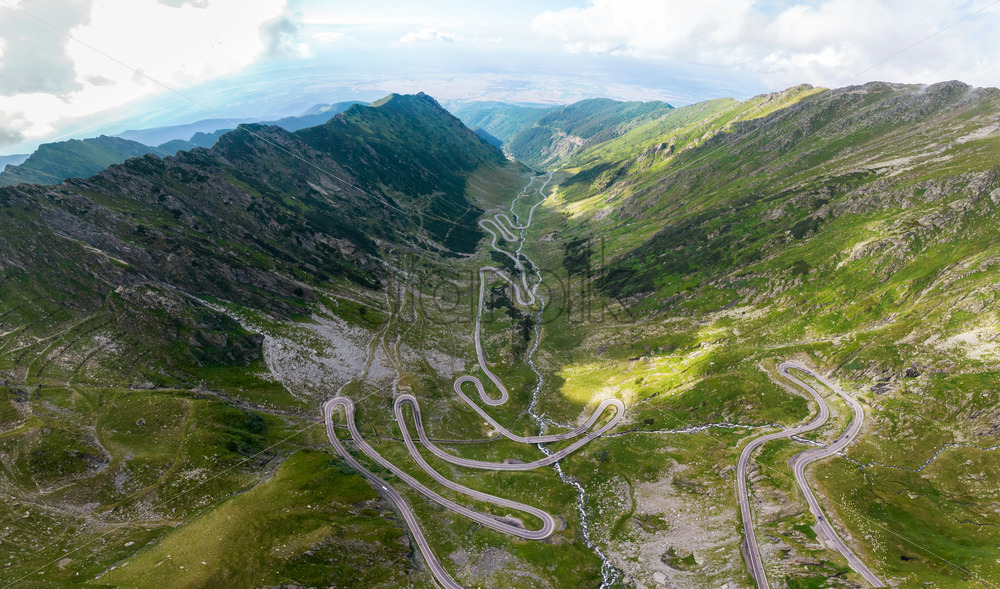 Aerial drone panoramic view of nature in Romania. Transfagarasan route with cars in Carpathian mountains, mountains slopes covered with greenery