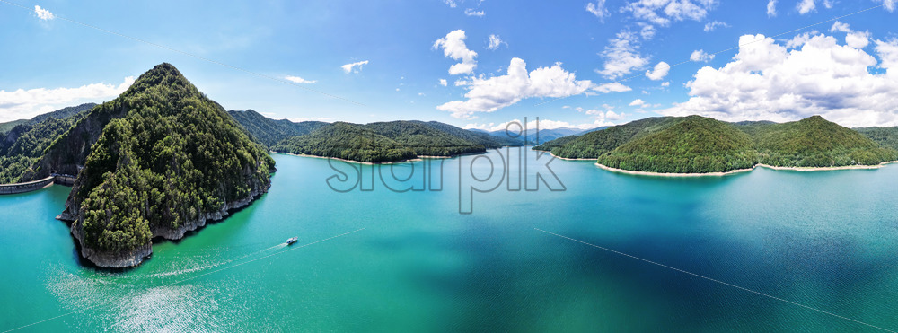 Aerial drone panoramic view of nature in Romania. Valley in Carpathian mountains with Vidraru lake, floating boat, green slopes around