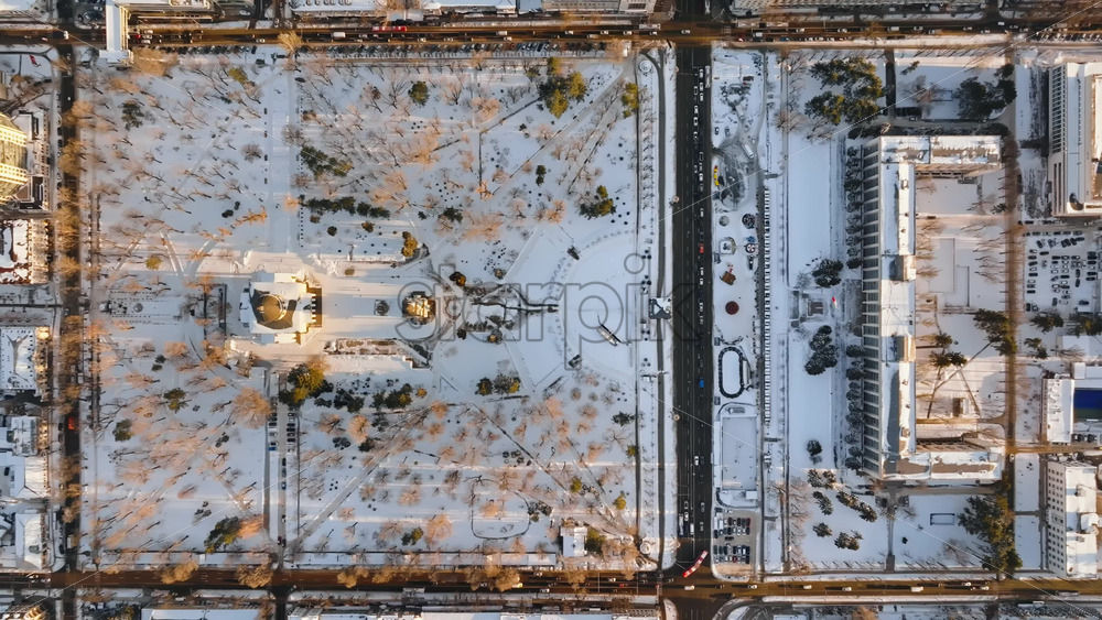 Aerial drone top view of the Bell tower and the Metropolitan Cathedral of Christ’s Nativity. City center covered in snow at sunset in Chisinau, Moldova Royalty Free Stock Video Footage
