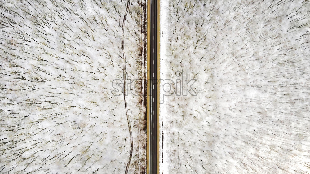 Aerial drone vertical view of nature in winter in Moldova. Road going through multiple bare trees covered with snow