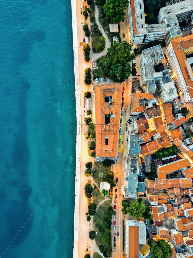 Aerial drone vertical view of Zadar, Croatia. Historical city with old buildings, narrow streets and Adriatic sea coast