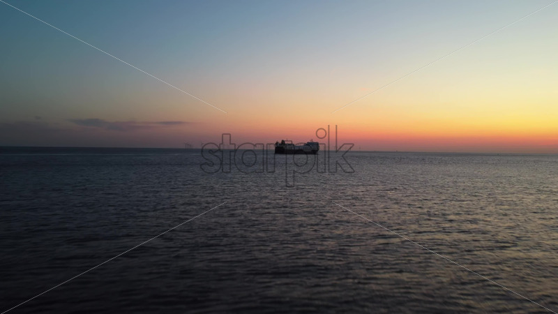 Aerial drone vew of cargo boat near port of Liverpool Great Britain at sunset Royalty Free Stock Video Footage