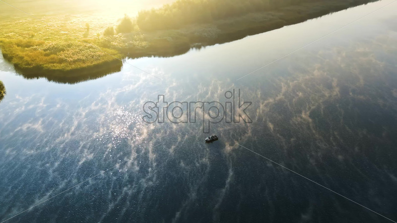 Aerial cinematic drone view of a man in a boat fishing on Nistru river at sunrise. Fog on the water in Moldova