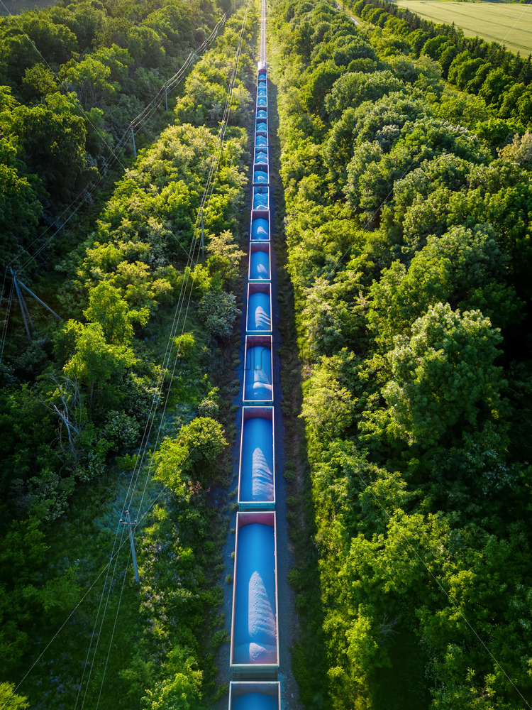 Aerial drone view of a moving train on railway with lush greenery around it in Moldova