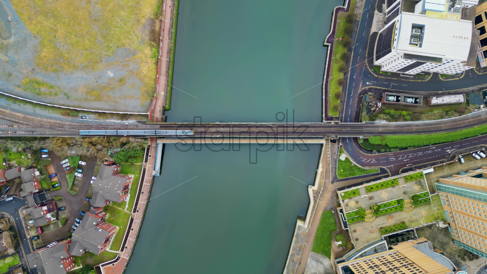 Aerial drone view of a train moving over the Belfast Railway Bridge above River Lagan in Belfast, Northern Ireland Royalty Free Stock Video Footage