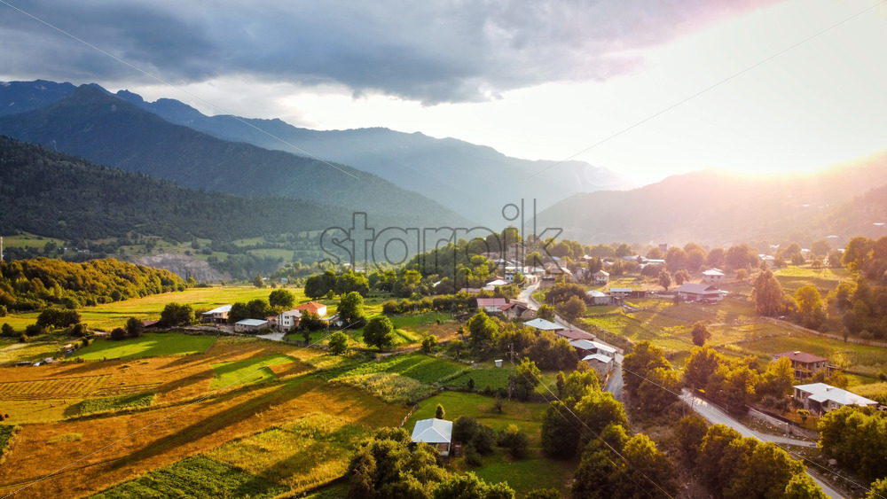 Aerial drone view of a village in Georgia at sunset. Valley, fields and buildings, mountains and hills slopes covered with greenery, cloudy sky