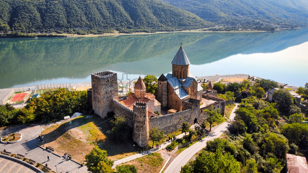 Aerial drone view of Ananuri Castle, Georgia. Aragvi river, walking touristst, greenery