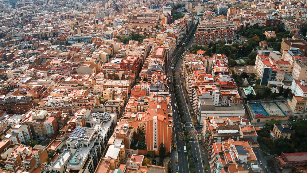 Aerial drone view of Barcelona, Spain. Blocks with multiple residential and office buildings, streets with greenery and cars