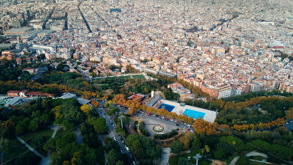 Aerial drone view of Barcelona, Spain. Multiple residential and office buildings, a lot of greenery