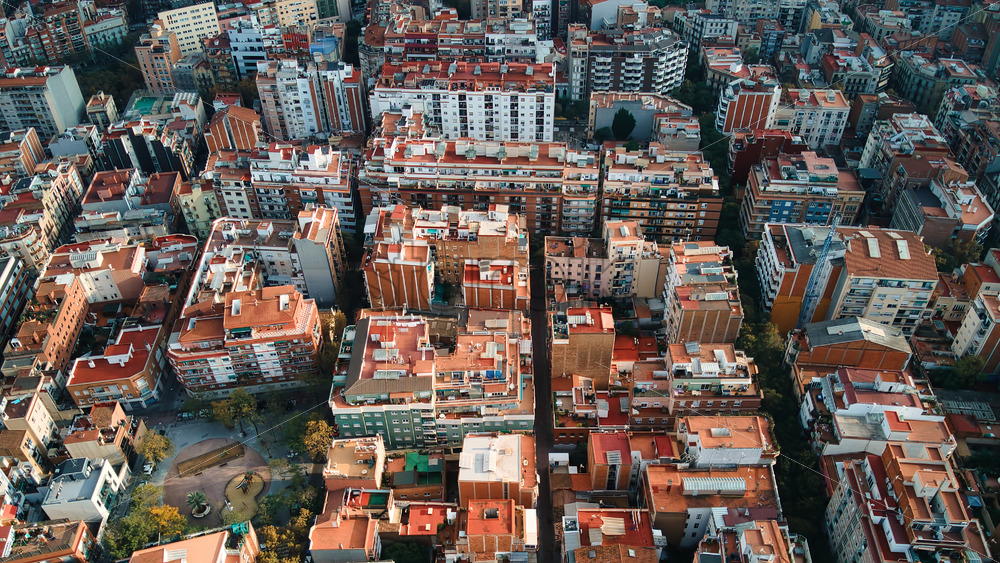 Aerial drone view of Barcelona, Spain. Blocks with multiple residential buildings, streets with greenery
