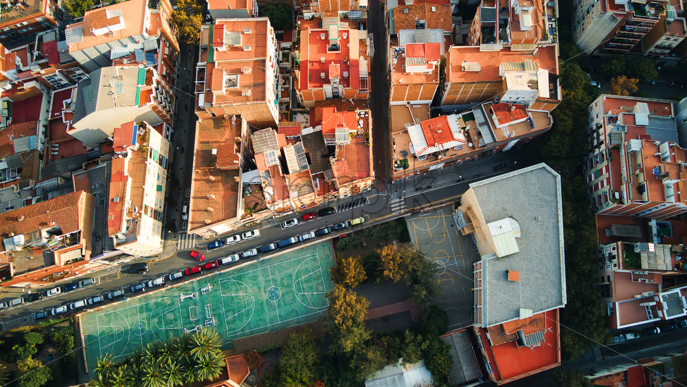 Aerial drone view of Barcelona, Spain. Blocks with multiple residential buildings, streets with greenery and courts