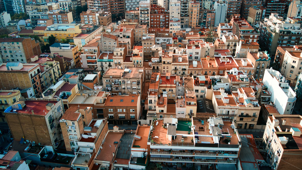 Aerial drone view of Barcelona, Spain. Blocks with multiple residential buildings, streets