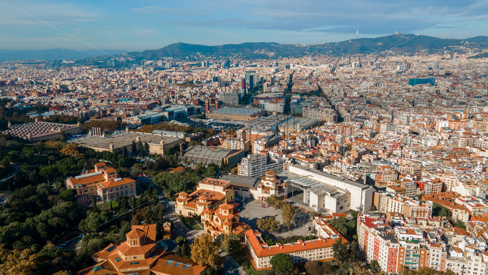 Aerial drone view of Barcelona, Spain. Multiple buildings, greenery