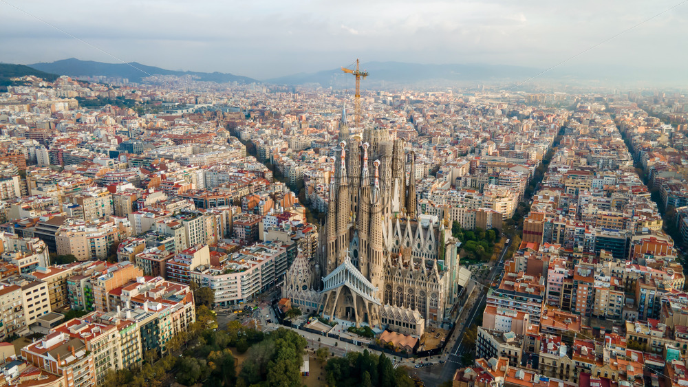Aerial drone view of Barcelona, Spain. Blocks with multiple buildings, roads, Sagrada Familia