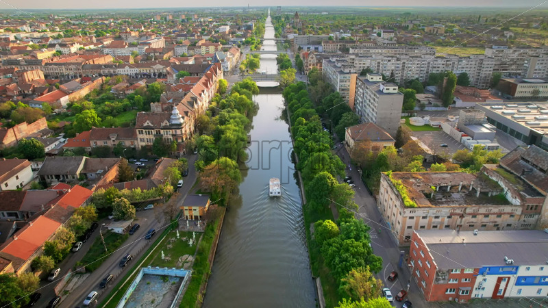Aerial drone view of Bega river in Timisoara, Romania. View of the river with floating boat, greenery and historical buildings on the both sides of the river and bridges Royalty Free Stock Video Footage