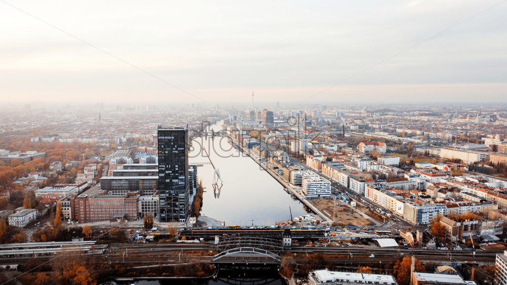 Aerial drone view of Berlin, Germany. District with river, yellowed trees, buildings and Berlin Television Tower in the distance