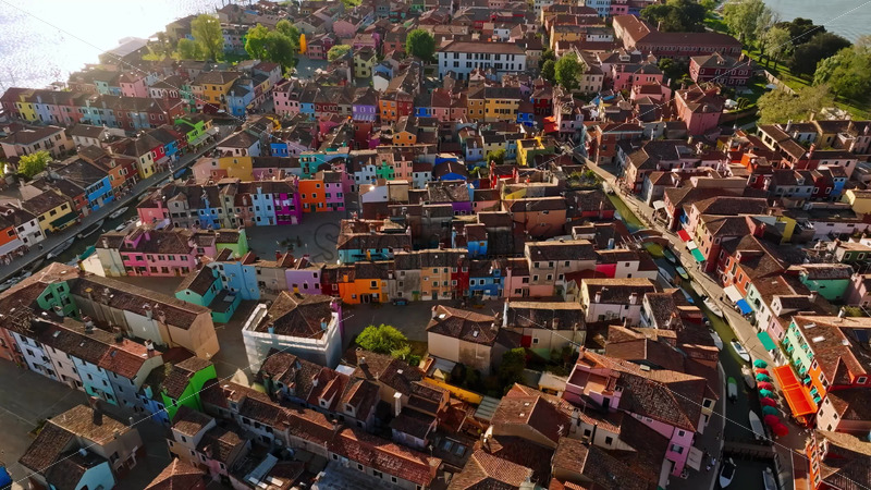 Aerial drone view of boats on the sides of a canal near the colourful houses of Burano Island, Italy Royalty Free Stock Video Footage