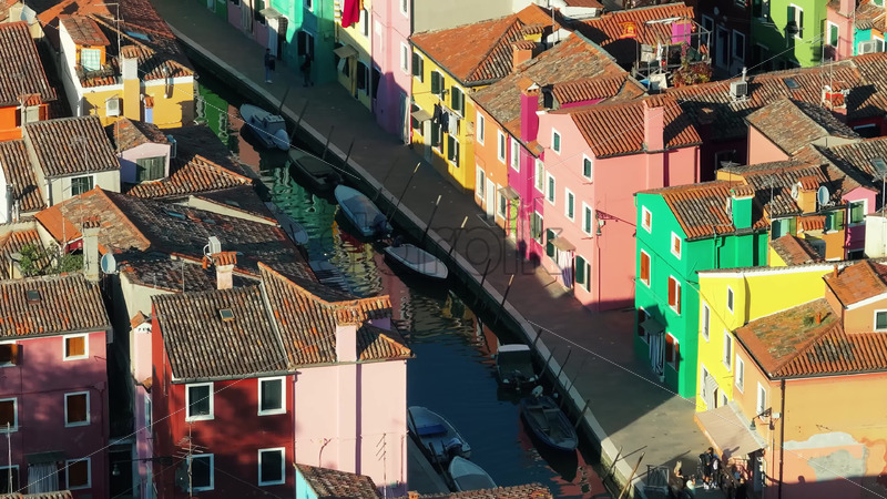 Aerial drone view of boats on the sides of a canal near the colourful houses of Burano Italy Royalty Free Stock Video Footage